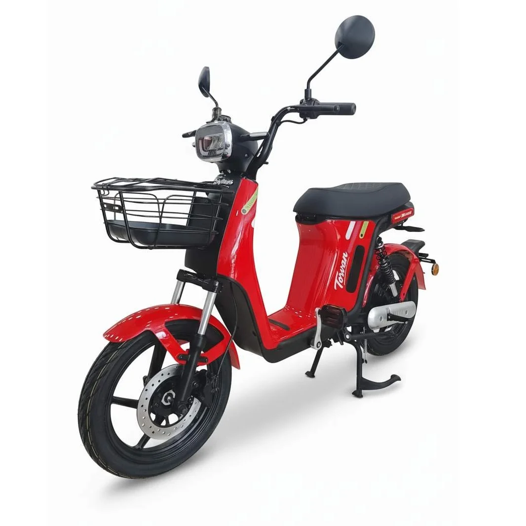 Bicimoto eléctrica urbana, velocidad máxima 45 km/h, autonomía 70 km por carga, tiempo de recarga 6-8 horas en cualquier enchufe 100-240V. Frenos de disco delantero y tambor trasero. Neumáticos 80/90-14 sin cámara resistentes a pinchazos. Dimensiones 1750 x 720 x 1160 mm, peso 55 kg sin batería, paquete 1560 x 380 x 860 mm. Bajo mantenimiento, sin gasolina. Ideal para estudiantes, profesionales y desplazamientos diarios. Cantidad por contenedor: 132 unidades para contenedor 40″ HQ (SKD).