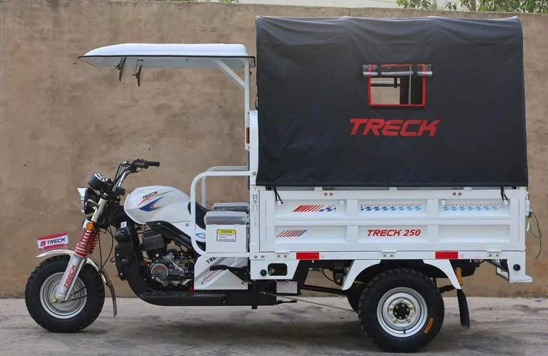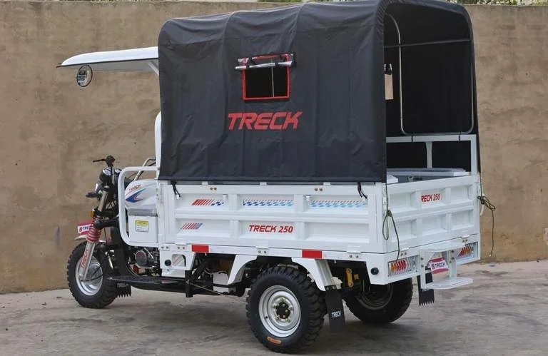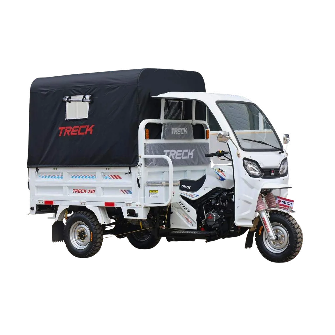 Motor monocilíndrico 4 tiempos 250cc, potencia 15.4 HP a 7000 rpm, torque máximo 13 Nm a 6000 rpm, refrigeración por aire, arranque eléctrico y pedal. Velocidad máxima 60 km/h, rendimiento 23 km/L. Transmisión 5 velocidades + reversa. Suspensión delantera telescópica con resorte, trasera con muelles y resorte. Frenos de tambor delantero y trasero. Neumáticos 4.50-12 en ambos ejes. Distancia al suelo 107 cm. Tanque 15 litros, carga máxima 500 kg. Dimensiones 3.25 x 1.20 x 1.35 m, peso bruto 320 kg.